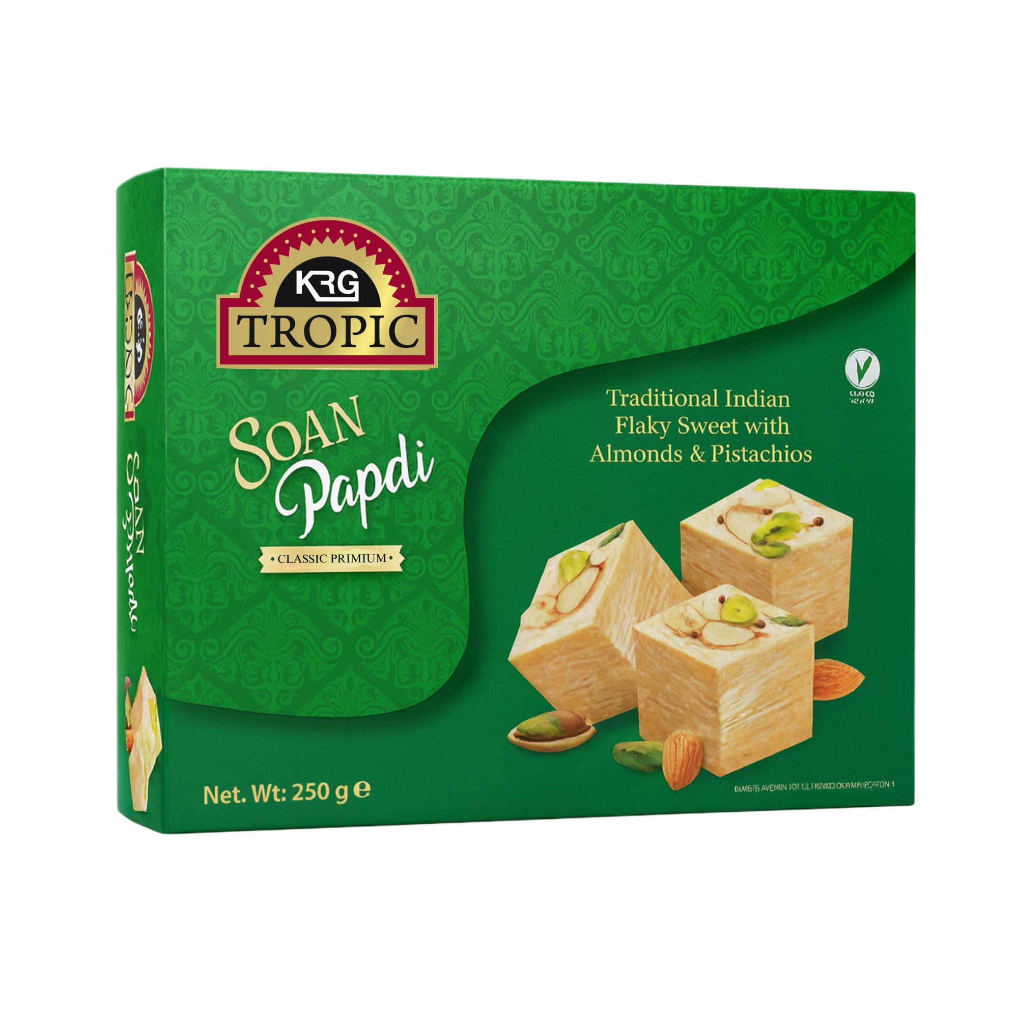Răsfață-te cu gustul clasic al Soan Papdi, un desert tradițional indian cunoscut pentru textura sa delicată, sfărâmicioasă și pentru modul în care se topește în gură. Preparat cu grijă dintr-un amestec de zahăr, făină de grâu rafinată, făină de năut și ulei rafinat de palmier, acest desert oferă aroma autentică a unei delicatese îndrăgite. Dulceața este echilibrată perfect cu parfumul cardamomului, iar fiecare mușcătură este îmbogățită de crocantul fin al migdalei și fisticului.